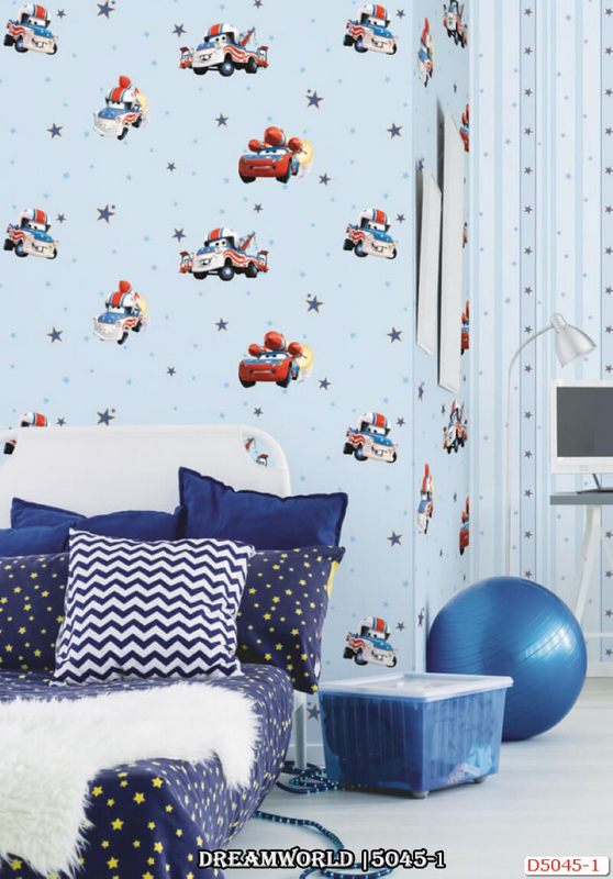 Phòng ngủ của bé trai đã trở nên đẹp và sống động hơn khi được trang trí bằng mẫu giấy dán tường màu xanh với họa tiết hoạt hình 5045-1.